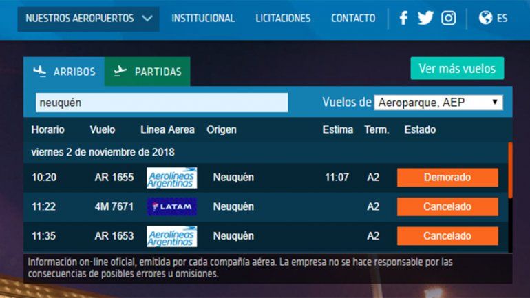 Si bien los vuelos programados a primera hora de esta mañana partieron en horario desde el Aeropuerto Presidente Perón, los de las 11.30 programados para salir desde Buenos Aires a esta ciudad están cancelados, tal como lo informaron desde Aeropuertos 2000.