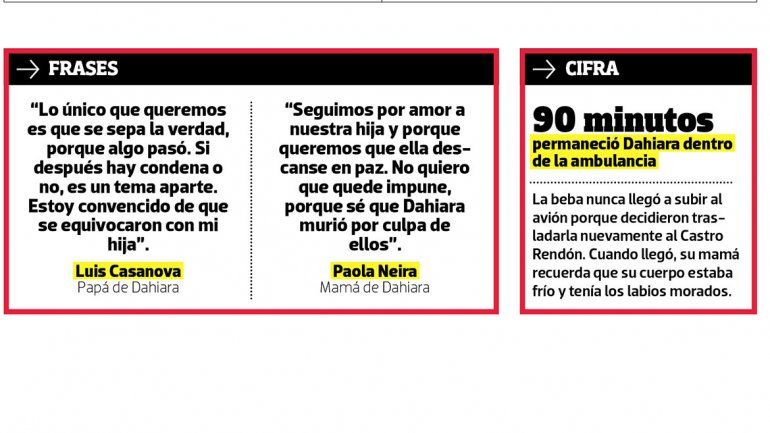 La fecha había sido pautada para el 10 de octubre ya que la pequeña había evolucionado. Ese día, Dahiara fue trasladada por el SIEN hasta el aeropuerto neuquino, pero el vuelo sanitario nunca se realizó y la beba permaneció una hora y media en la ambulancia. “No la cuidaron”, confió entre lágrimas la mujer quien junto con el papá de la pequeña denunciaron a los médicos del SIEN por mala praxis.
