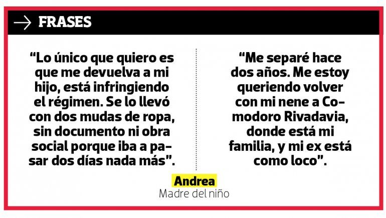 Respecto del motivo que pudo haber tenido su ex para adoptar esa medida, Andrea confió que unos días atrás le comentó su intención de mudarse con el nene a Comodoro, de donde son oriundos.