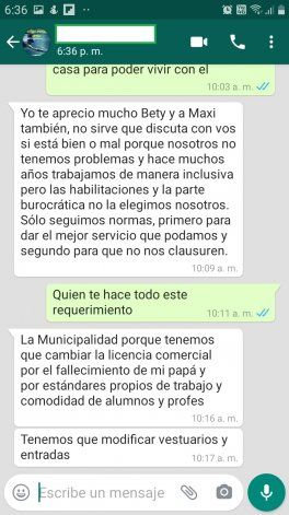 De los mensaje que facilitó Beatriz a LMN, justificaron que para que Maxi pudiera inscribirse había que “cambiar la licencia comercial”. “La Municipalidad pide hacer el requerimiento porque tenemos que cambiar la licencia comercial por el fallecimiento de mi papá y por estándares propios de trabajos y comodidad de alumnos y profes”, recibió esta madre por Whastapp.