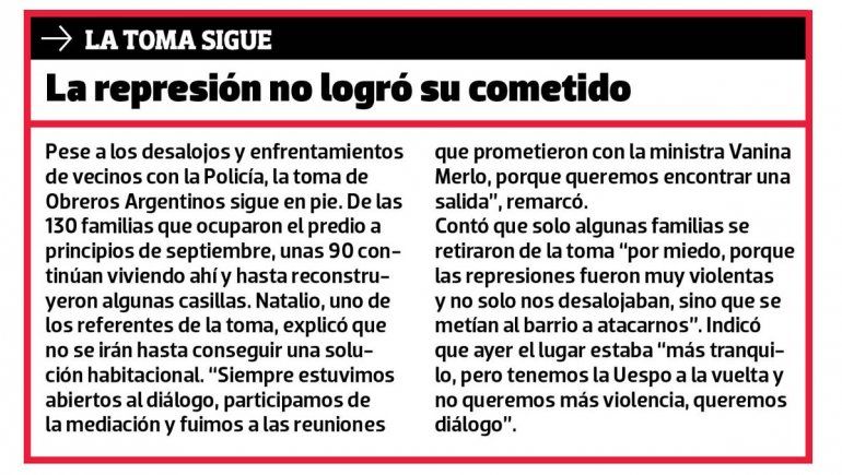 La toma Obreros Argentinos se inició a principios de septiembre, en un predio ocioso ubicado cerca de la costa del Limay. El 17 de octubre, hubo un primer desalojo violento de las 130 familias que estaban asentadas ahí, pero la gente volvió al lugar al día siguiente.