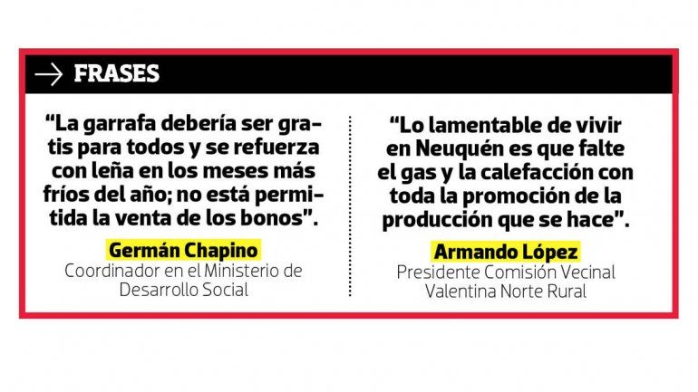 Según aclaró, hicieron pedidos al área de Desarrollo Social para que entreguen más bonos y evitar así que los vecinos paguen altos precios por una garrafa de 10 kilos, que dura apenas 4 días. Aclaró que algunas personas incluso salen a buscar leña por el barrio o queman trapos viejos para generar calor dentro del hogar.