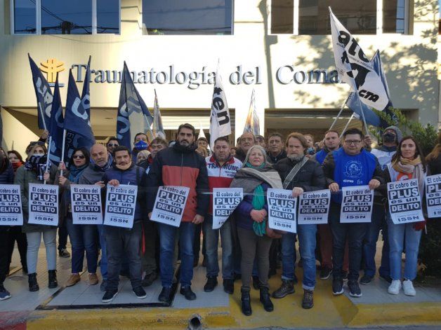 “Venimos a hacer una manifestación pública a raíz de la denuncia de compañeros por el cobro indebido del plus”, expresaron en una conferencia de prensa realizada en la puerta de la clínica. Indicaron que hace unos días recibieron una gran cantidad de llamados de afiliados que concurrieron a Traumatología del Comahue y que se fueron sin poder ser atendidos, esto se debió a que querían cobrarles una cantidad de dinero no acordada con la obra social.