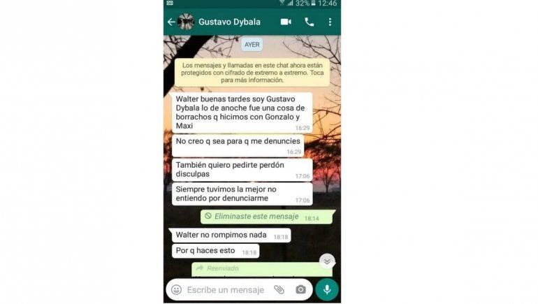 La respuesta de Gustavo Dybala no tardó en llegar y fue a través de un mensaje de Whatsapp que le envió argumentando que todo había sido una "cosa de borrachos" y que lo sucedido no era para que lo denuncie. Además le pidió disculpas.