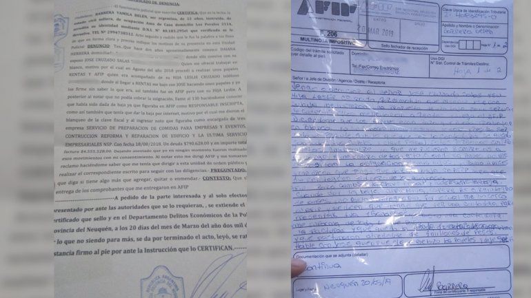 Al no recibir la AUH por segunda vez, recurrió nuevamente a la AFIP y allí se enteró de la maniobra. "A mi nombre fueron emitidas facturaciones con una suma de unos 4 millones de pesos. Facturaron a empresas de servicios petroleros y hasta la UTA. Lo único que me dieron fueron los comprobantes emitidos, CUIT que recibieron y el tipo de facturas", puntualizó.