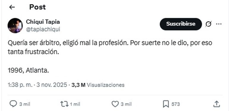 "Quería ser árbitro, eligió mal la profesión. Por suerte no le dio, por eso tanta frustración. 1996, Atlanta", publicó el Chiqui en su cuenta personal.