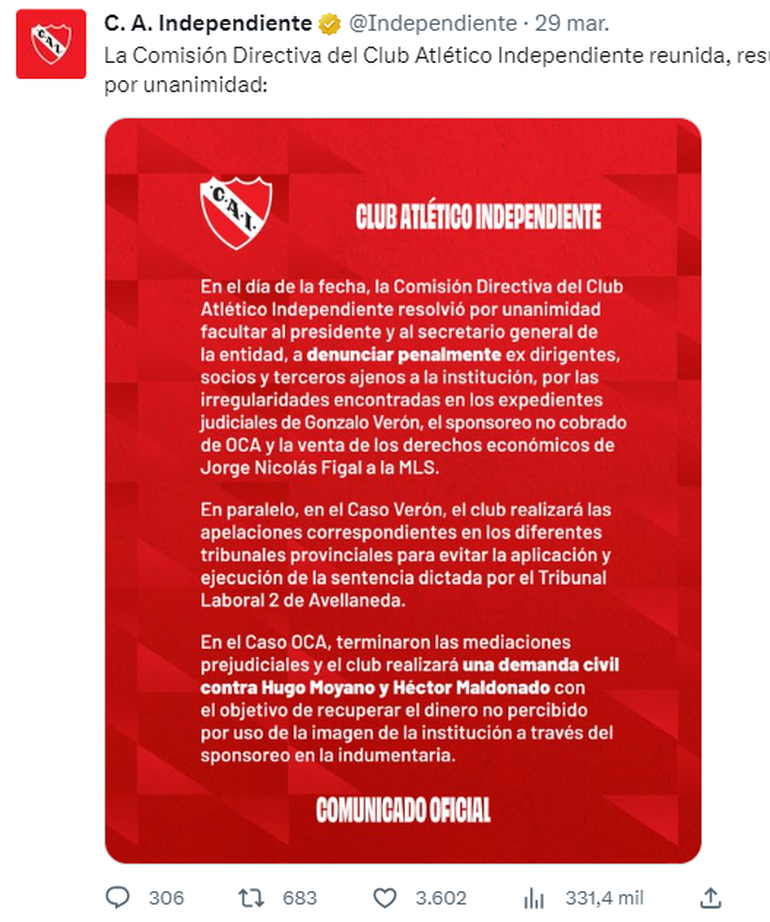 Cabe recordar que este domingo, desde las 14, Independiente recibirá a Estudiantes de La Plata y el próximo domingo hará lo mismo frente a Racing en el clásico de Avellaneda.
