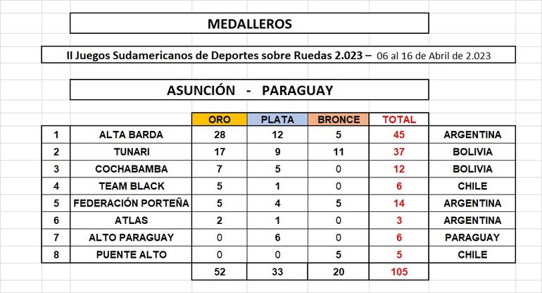 En total el Albiverde obtuvo 45 medallas, con 28 preseas doradas, 12 de plata y cinco de bronce quedando como escoltas los dos equipos bolivianos, Tunari con 37 (17,9 y 11) y Cochabamba con 12 (7 doradas y cinco plateadas).