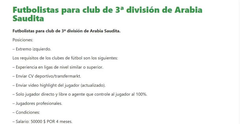 El salario ofrecido para los aspirantes a ser futbolistas de la tercera división de Arabia Saudita es de US$ 50.000 por cuatro meses de competencia.
