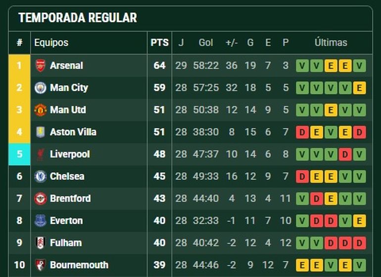 El triunfo le permite al Arsenal mantener los cinco puntos de ventaja sobre el City, que el sábado había derrotado 1 a 0 al Leeds como visitante y además tiene un partido menos. Primero y segundo se enfrentarán en la fecha 33, a mediados de abril.