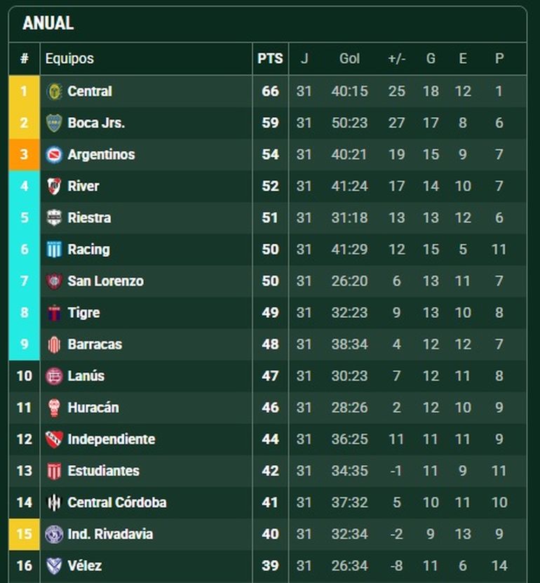 En la tabla anual, el equipo de Marcelo Gallardo suma 52 puntos, detrás de Central (66) y Boca (59), mientras que Riestra quedó con 51 y Argentinos Juniors (54) lo superó con la victoria a última hora.
