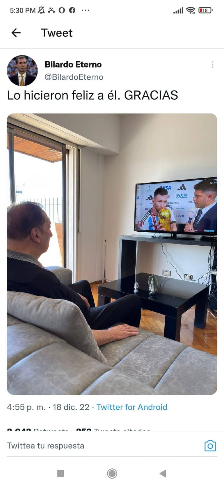 Festeje doctor, que usted también se lo merece. De un campeón del mundo a otro. Carlos Bilardo no solo que vio el partido sino que se emocionó con la consagración argentina.