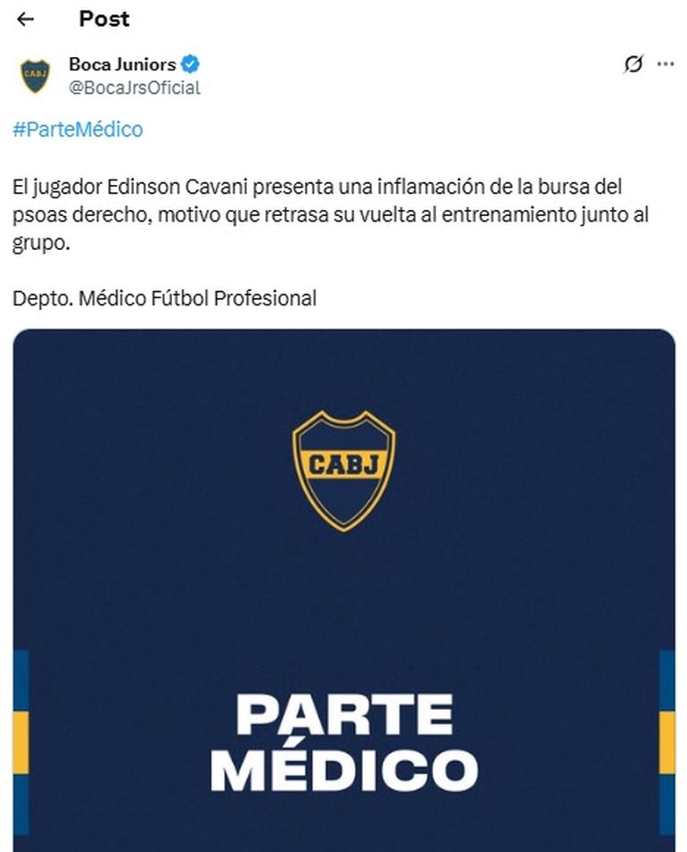 "El jugador Edinson Cavani presenta una inflamación de la bursa del psoas derecho, motivo que retrasa su vuelta al entrenamiento junto al grupo", fue el comunicado que publicó Boca en su cuenta oficial de la red social X, para actualizar novedades del uruguayo.