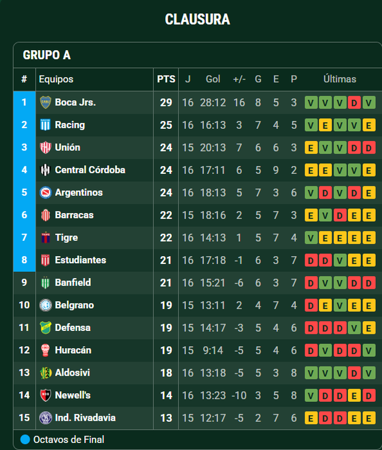 El Taladro, al no haber podido sumar de a tres, estuvo a las puertas de los playoff: sumó 21 unidades, las mismas que el Pincha, que por lo pronto seguirá su camino en los octavos de final del Torneo Clausura gracias a la diferencia de gol (tiene -1, contra -6 de los del Sur). El Matador, pese a la caída contra el Xeneize, pasó séptimo; y sexto es Barracas Central, que también culminará este lunes su participación en la fase regular -a las 17 y ante Huracán-. El Globo, Defensa y Justicia y Belgrano todavía tienen chances e irán por la clasificación mañana.