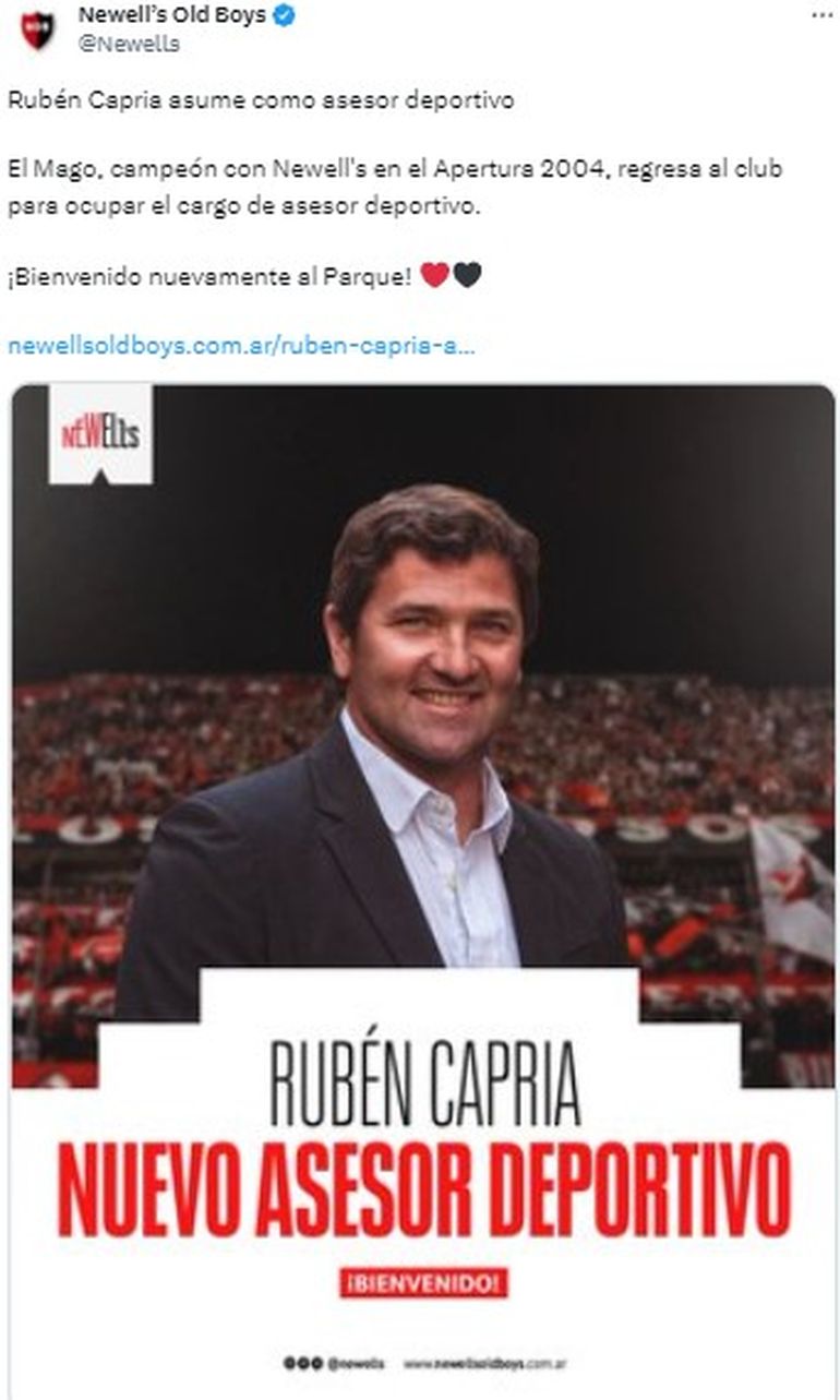 Es que el equipo rosarino confirmó a Ruben Capria como nuevo asesor deportivo de la institución, con vistas de mejorar el nivel deportivo. "El Mago, campeón con Newell's en el Apertura 2004, regresa al club para ocupar el cargo de asesor deportivo. ¡Bienvenido nuevamente al Parque!", escribió el club en su cuenta oficial de X (ex Twitter).