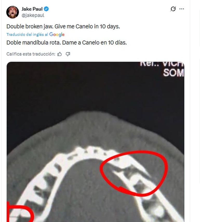 Luego posteó una imagen de la radiografía de su mandíbula, donde se observan las fuertes lesiones que produjeron los golpes de Joshua: “Doble rotura de mandíbula. Dame a Canelo en 10 días”.
