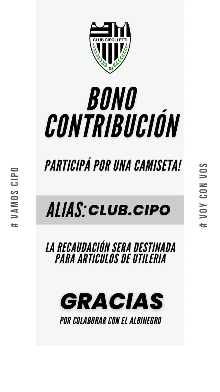 No son tiempos sencillos para los clubes por la delicada situación económica que atraviesa el país. Hasta las instituciones de magnitud de la región, como el caso de Cipolletti, tienen que recurrir a distintas formas para recaudar fondos y hacer frente al día día. El Albinegro lanzó a través de sus redes sociales un bono contribución para resolver cuestiones fundamentales en un club que forma parte del Federal A.
