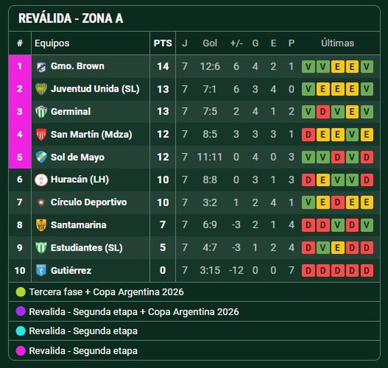 Después vienen con 6 Costa Brava y Villa Mitre, que había empatado con el colista Kimberley el sábado, y Cipo tiene 5, con pocas chances de lograr algún objetivo en esta etapa.