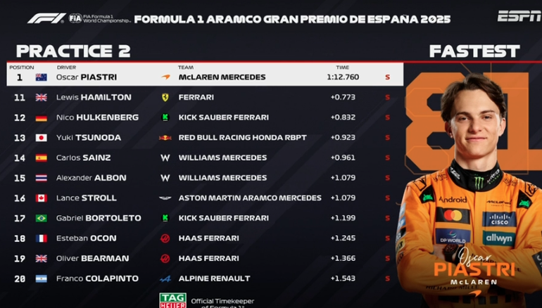 El piloto argentino Franco Colapinto terminó en la última posición en las dos prácticas libres que se llevaron a cabo este viernes en el Gran Premio de España de Fórmula 1. La sesión fue para los McLaren, primero para el británico Lando Norris y en la segunda, para Oscar Piastri.