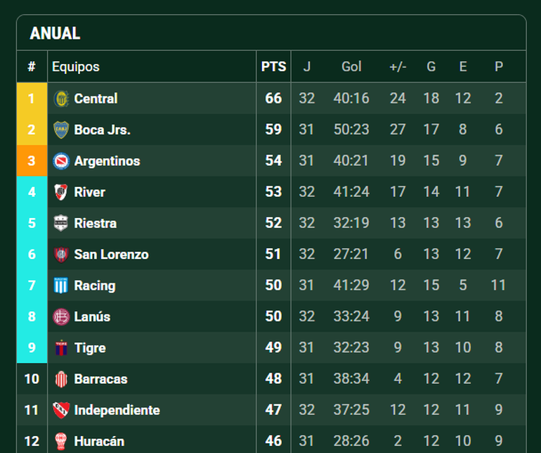 River quedó en zona de Copa Sudamericana tras no haber cumplido con la obligación de vencer a Vélez en la última fecha: el empate que lo dejó estacado en 53 puntos y sin posibilidades de alcanzar a Argentinos Juniors en la tabla anual. Aun así, el equipo de Marcelo Gallardo mantiene -pocas- opciones de clasificar a la Copa Libertadores 2026, aunque su situación se complicó más que nunca. La igualdad frente al Fortín lo ubicó en el cuarto lugar a nivel general, por detrás de Rosario Central, Boca y Argentinos.