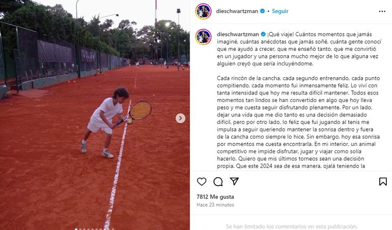 A través de un extenso comunicado en sus redes sociales, el tenista de 31 años anunció que dejará el tenis profesional. Su deseo es tener el "momento final, el más hermoso cierre" en 2025, en Argentina.