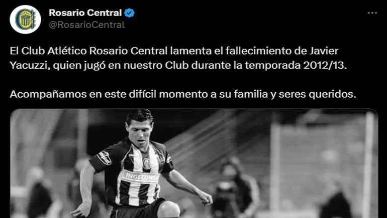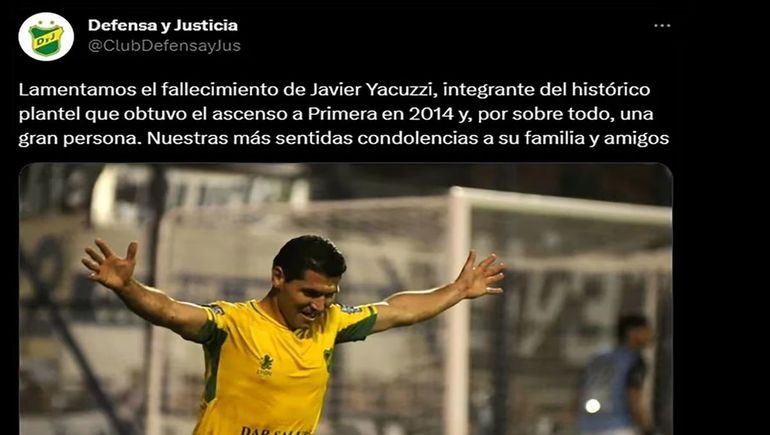 La entidad de Sarandí, en la que vivió los mejores años de su carrera, tuiteó: "Arsenal lamenta profundamente el fallecimiento de Javier Yacuzzi, campeón de la Copa Sudamericana 2007 y Suruga Bank 2008. Enviamos nuestras condolencias a sus familiares y seres queridos. Descansá en paz, Yacu".