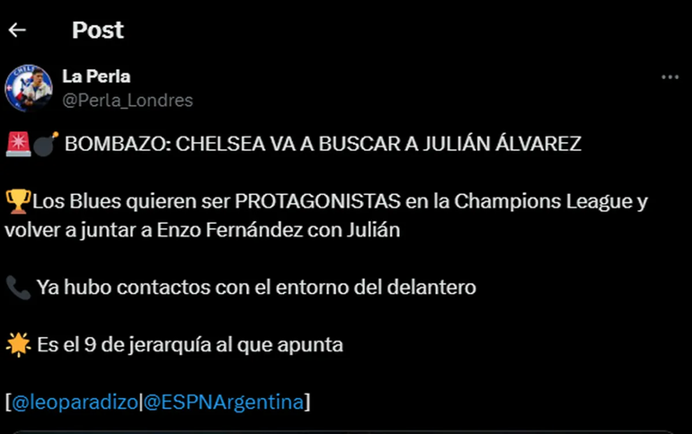 Luego, el mismo Paradizo desde Chile (en la previa del partido de la Selección Argentina), dio más detalles al respecto. El comunicador adelantó: "averiguando la situación de Enzo Fernández me encontré con esta noticia que tiene que ver con el interés concreto del Chelsea por llevarse a Julián. Busca reforzarse al máximo para tener un rol protagónico en la próxima Champions. Billetera tiene."