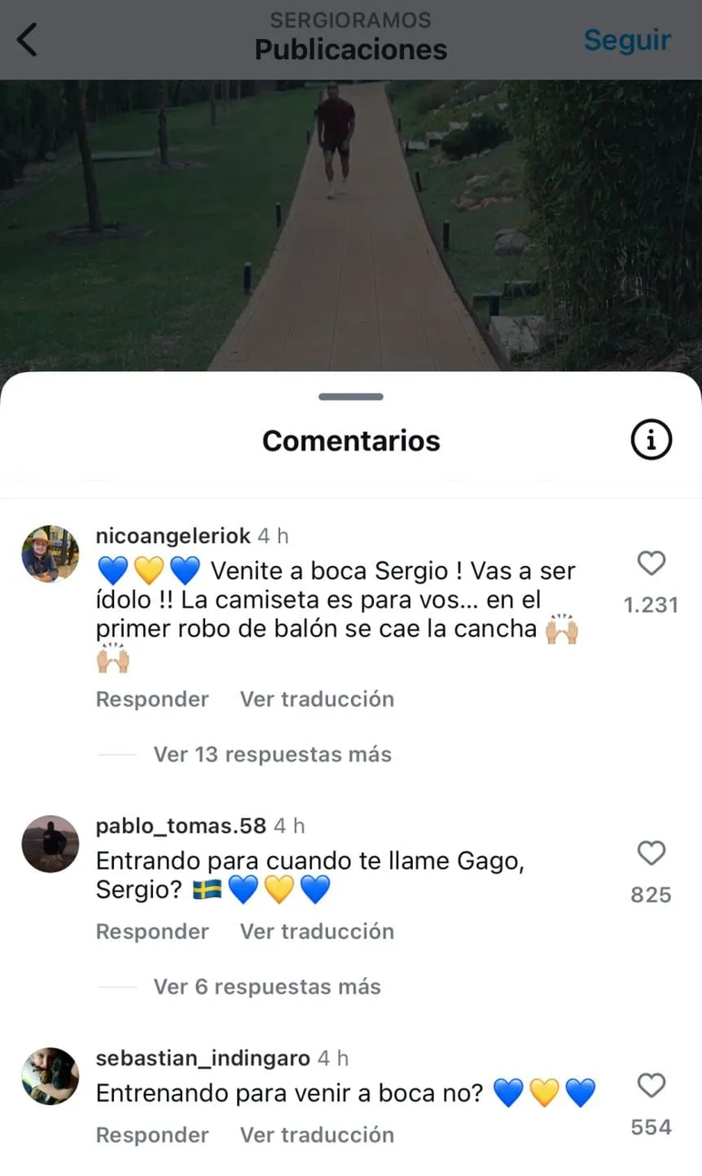 ¿"Entrenando para venir a Boca?; "Boca te espera", “¿Entrenando para cuando te llame Gago, Sergio?”, “¡Venite a Boca Sergio! Vas a ser ídolo!! La camiseta es para vos. En el primer robo de balón se cae la cancha”, entre otros miles de comentarios que inundaron la publicación del multicampeón.
