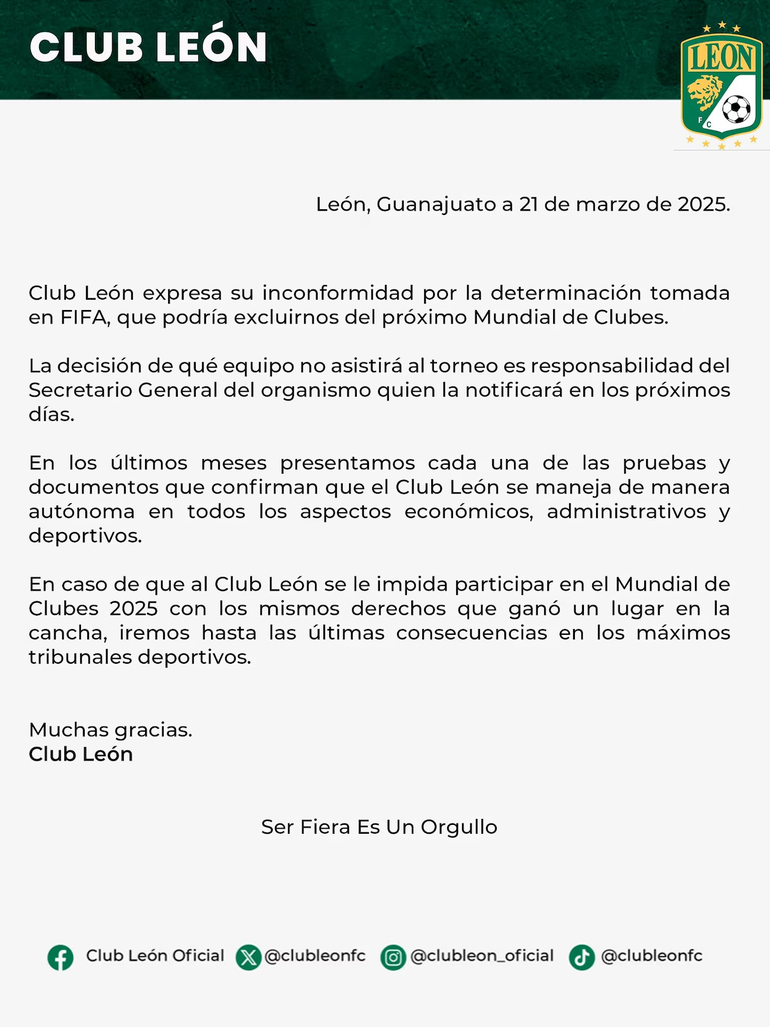 “De conformidad con el artículo 10, párrafo 4, del Reglamento de la Copa Mundial de Clubes de la FIFA 2025, la FIFA ha determinado que el Club León sea retirado de la competición, y que el club que sea admitido como sustituto se anuncie oportunamente", concluyó el mensaje.