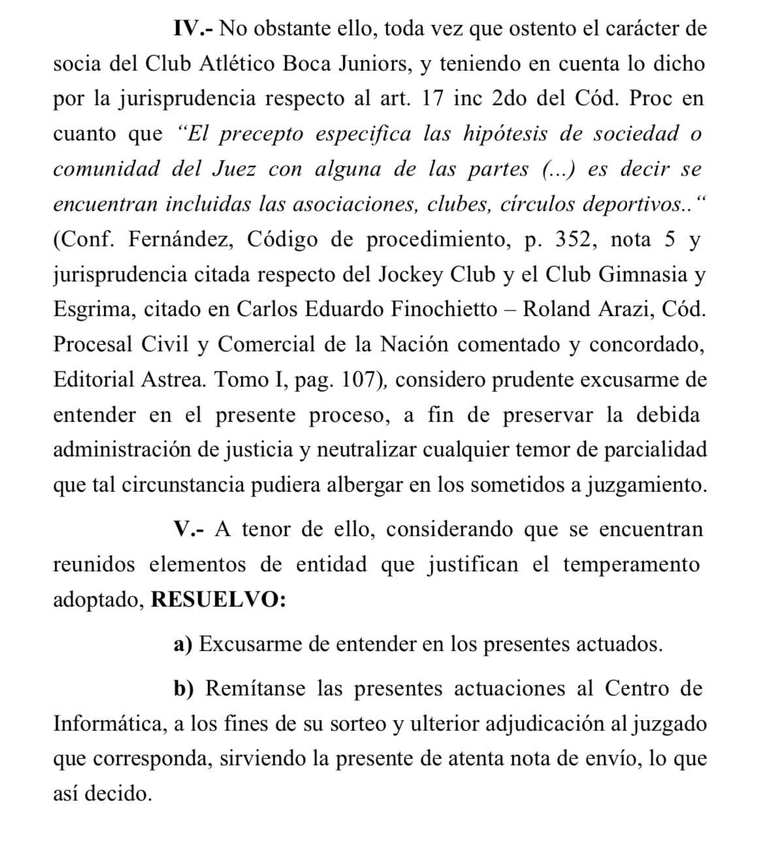 "Ostento el carácter de socia del Club Atlético Boca Juniors", dijo la magistrada en su fallo, y concluyó: "Considero prudente excusarme de entender en el presente proceso, a fin de preservar la debida administración de justicia y neutralizar cualquier temor de parcialidad que tal circunstancia pudiera albergar en los sometidos a juzgamiento".