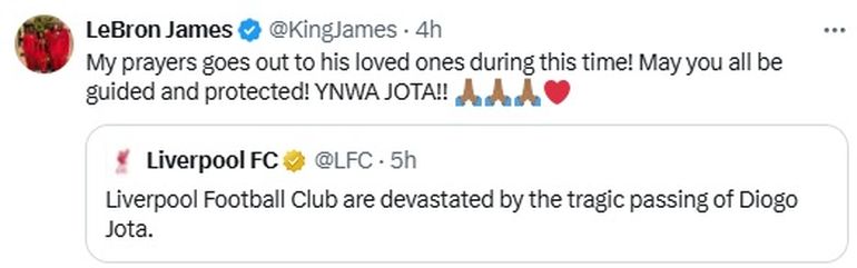 Otra figura mundial que se expresó es LeBron James, que además de figura internacional del básquet es dueño minoritario del Liverpool. ¡Mis oraciones están con sus seres queridos en este momento! ¡Que todos estén guiados y protegidos! ¡YNWA JOTA!", compartió el Rey en sus redes.