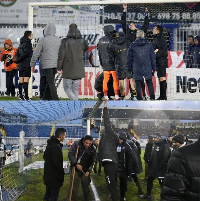 Ante esto, llegó uno de los encargados del campo de juego con una cinta métrica para chequear el estado de estos. Efectivamente, como percibió el juez de línea, el arco era entre 3 y 5 centímetros más bajo y le faltaban 10 centímetros de ancho.