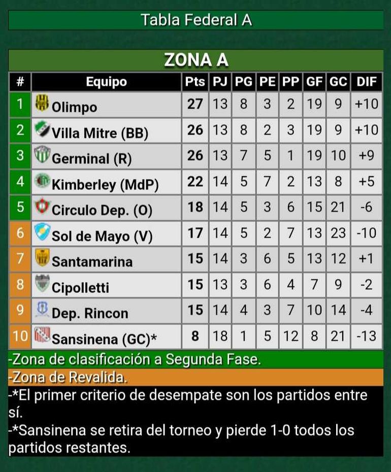 La sanción del Consejo Federal a Sansinena de Cerri, por haber abandonado el torneo por falta de recursos económicos, cambió el mapa de la tabla de posiciones, ya que se confirmó que cada partido pendiente del Tripero se da por ganado 1 a 0 a los rivales.