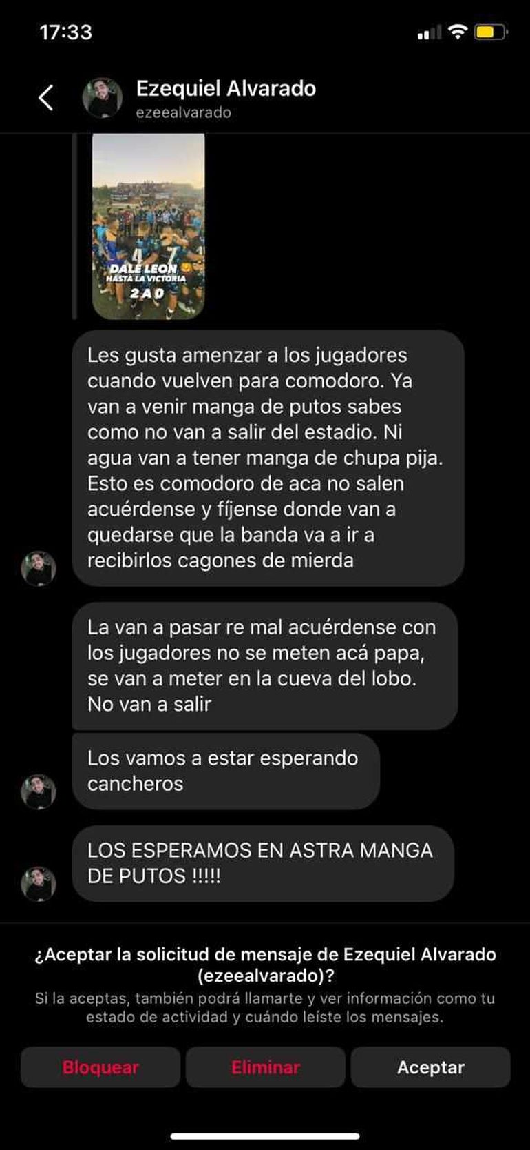 Junto al comunicado, la prensa del club neuquino adjuntó capturas de pantalla que certifican las amenazas. "Entendemos que el volumen desmedido de amenazas de muerte en redes sociales, medios de comunicación, e incluso llamados telefónicos a casas de familia advirtiendo "que nadie sale vivo" y que "ya no importa el partido sino reventar" a los neuquinos, nos pone en estado de alerta y en condiciones de recurrir a instancias nacionales para advertir del clima de violencia propugnado por el club Jorge Newbery", añade el comunicado.