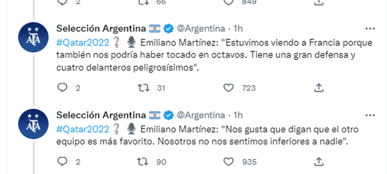 En cuanto al rival, "Dibu" expresó: "Estuvimos viendo a Francia obviamente porque era un rival que nos podía tocar en octavos de final. Es el último campeón del mundo, los cuatro de arriba son peligrosísimos, tiene una gran defensa y un gran arquero. No es sólo un jugador, los recaudos los tenemos pero nosotros vamos a tratar de hacer nuestro juego para hacerles daño".