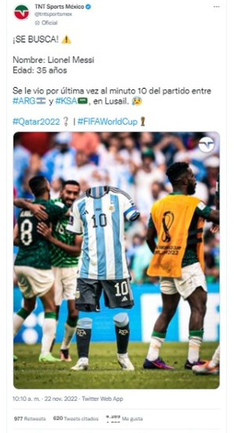 Los mexicanos no se quedaron atrás y también "le pegaron" al capitán de la selección argentina. TNT Sports del país azteca publicó la imagen del crack mundial en la que borraron su cuerpo y escribieron "Se busca".