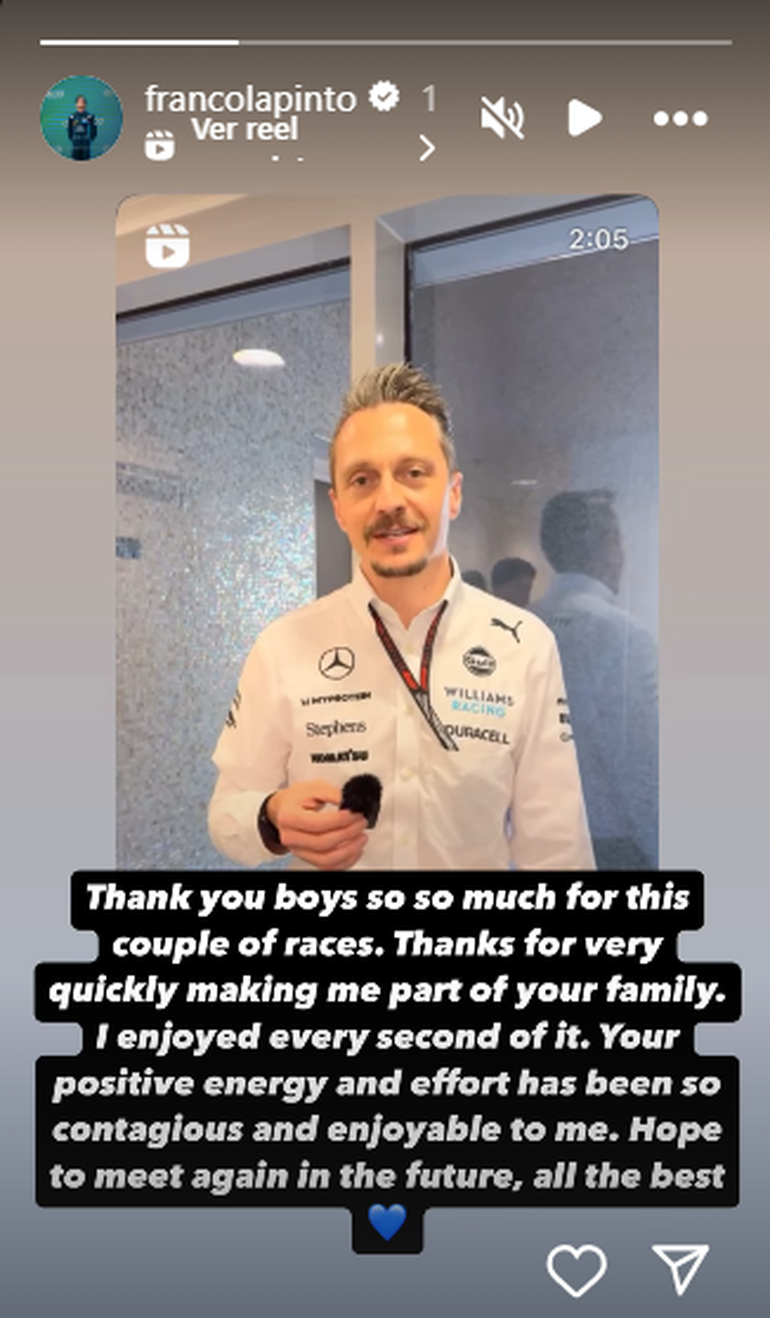 Lo curioso de este posteo es el sabor a despedida, lo cual sugiere que Colapinto podría continuar su carrera en otro equipo de la Fórmula 1. Incluso uno de los miembros del equipo le dice que es “triste verte ir”.