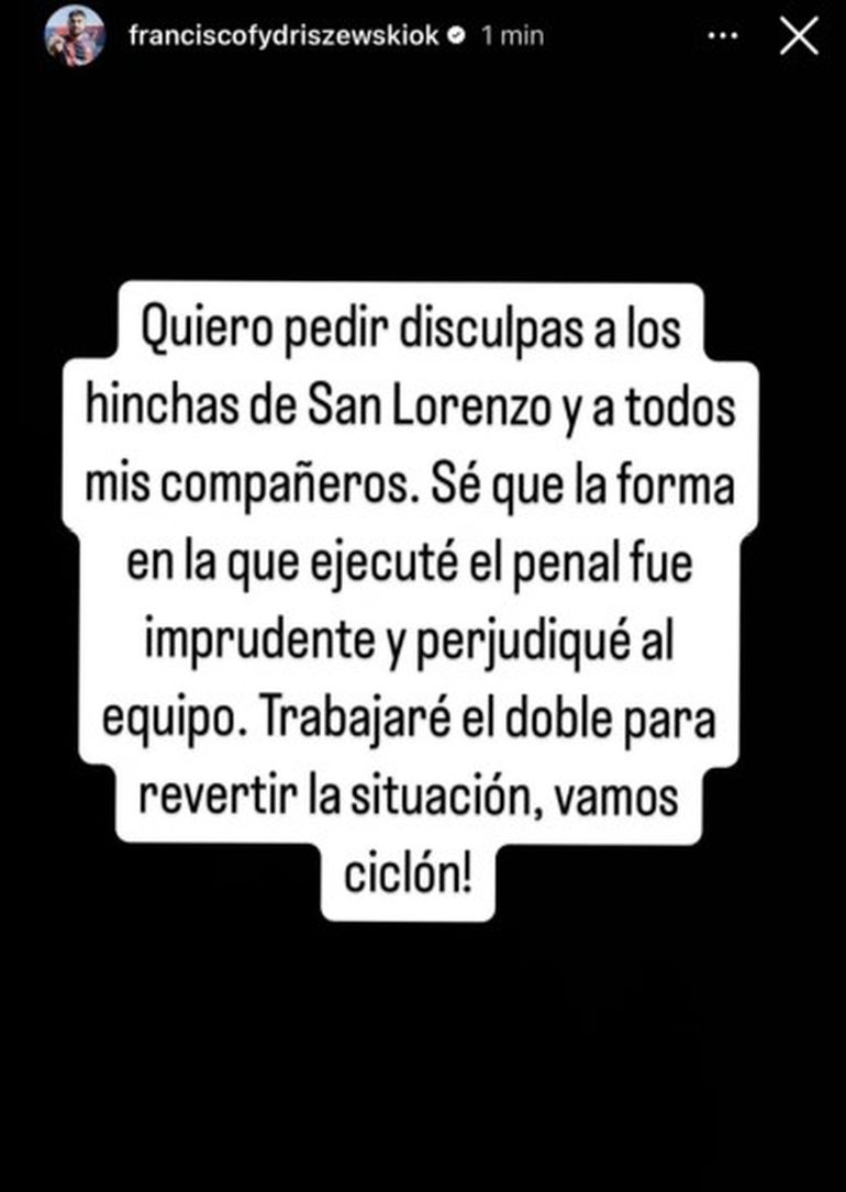 "Quiero pedir disculpas a los hinchas de San Lorenzo y a todos mis compañeros. Sé que la forma en la que ejecuté el penal fue imprudente y perjudiqué al equipo", manifestó el atacante en sus redes sociales, haciéndose cargo totalmente del error y de su decisión.