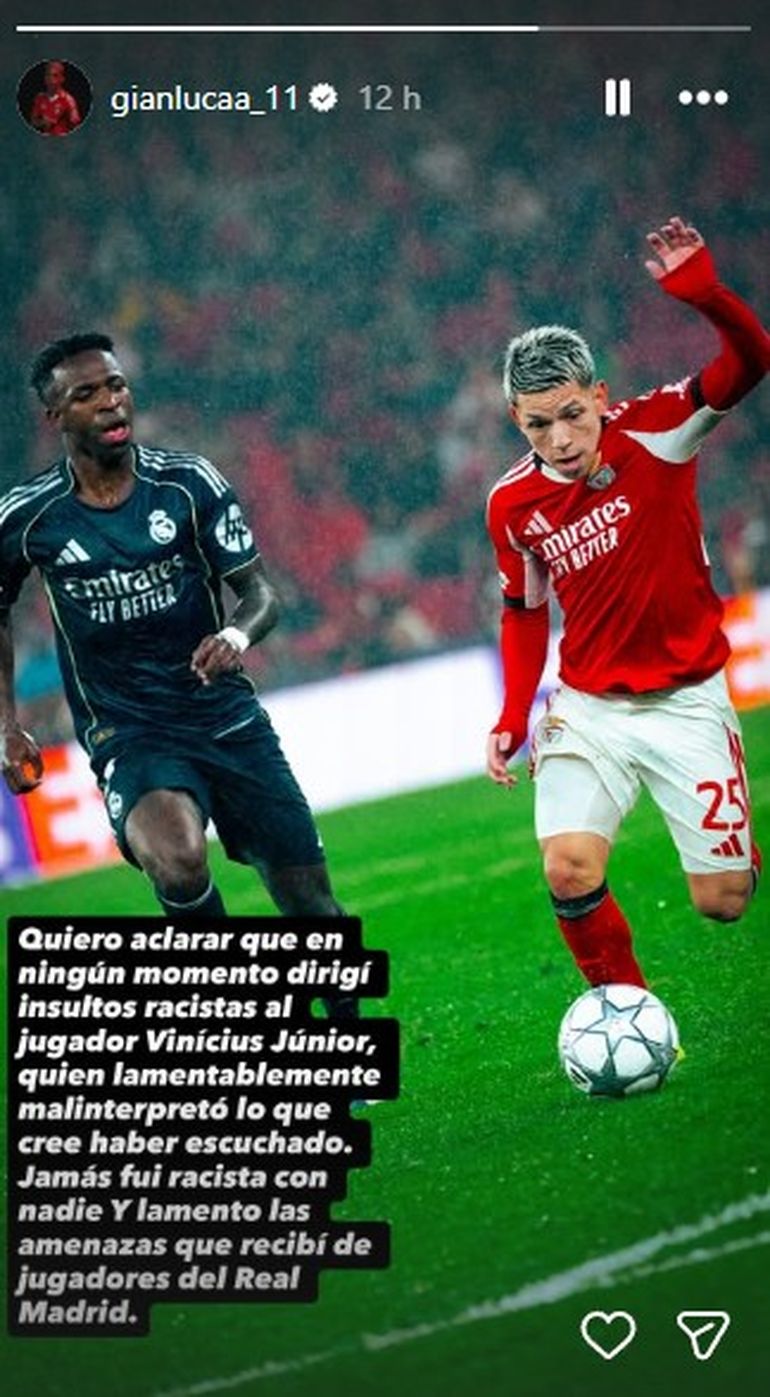 Por otra parte el Benfica le mostró todo su apoyo a Gianluca con un claro posteo en su cuenta de Instagram: "Juntos, a tu lado", escribió el club junto a las declaraciones de su jugador en las redes sociales.