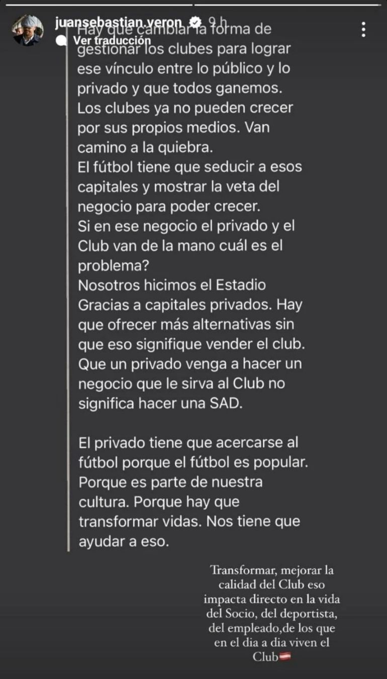 "Hay que cambiar la forma de gestionar los clubes para lograr ese vínculo entre lo público y lo privado y que todos ganemos. Los clubes ya no pueden crecer por sus propios medios. Van camino a la quiebra. El fútbol tiene que seducir a esos capitales y mostrar la veta del negocio para poder crecer. Si en ese negocio el privado y el club van de la mano, ¿cuál es el problema?", escribió Verón.
