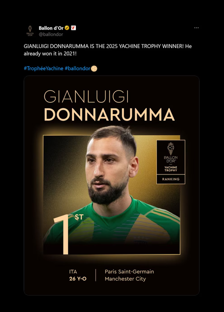 El triunfo de Donnarumma se sustentó en una temporada 2024/2025 excepcional con el París Saint-Germain (PSG), donde conquistó la Champions League, la Ligue 1, la Copa de Francia y el Trofeo de Campeones de Francia. Actualmente, el arquero italiano defiende la portería del Manchester City.