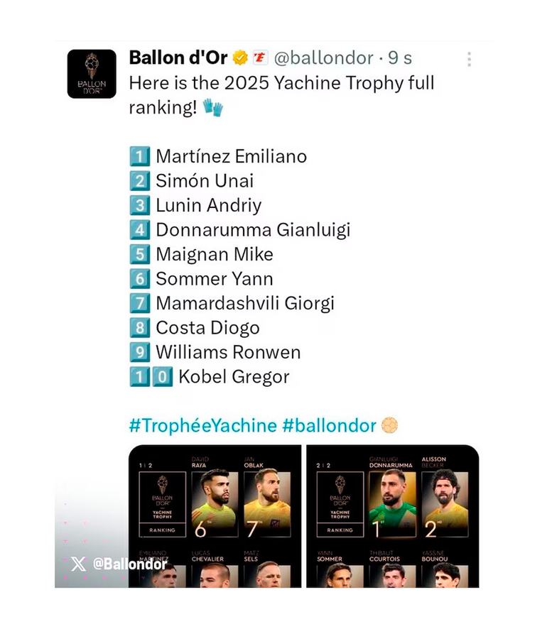 Segundos previos a la revelación del ganador entre los guardametas, en la cuenta oficial de X del evento publicó una lista con los finalistas, pero en el texto del posteo se pusieron los diez primeros de la edición de 2024, que tuvo como vencedor por segundo año seguido al portero de la Selección Argentina.