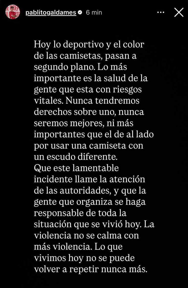 El otro chileno del equipo es Pablo Galdames, quien también subió una historia a Instagram donde afirmó: "Hoy lo deportivo y el color de las camisetas, pasan a segundo plano. Lo más importante es la salud de la gente que está con riesgos vitales. Nunca tendremos derechos sobre uno, nunca seremos mejores ni más importantes que el de al lado por usar una camiseta con un escudo diferente. Que este lamentable incidente llame la atención de las autoridades y que la gente que organiza se haga responsable de toda la situación que se vivió hoy. La violencia no se calma con más violencia. Lo que vivimos hoy no se puede volver a repetir nunca más".