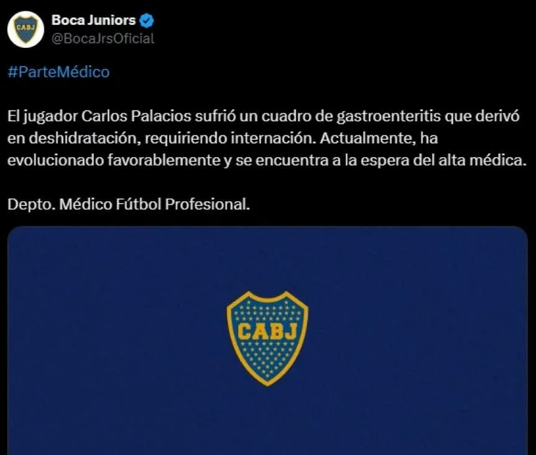 Carlos Palacios fue internado por un cuadro de gastroenteritis que derivó en una deshidratación. El jugador de Boca evolucionó de manera favorable y se encuentra a la espera del alta, según informó el cuerpo médico del club en un comunicado que fue publicado en redes sociales.