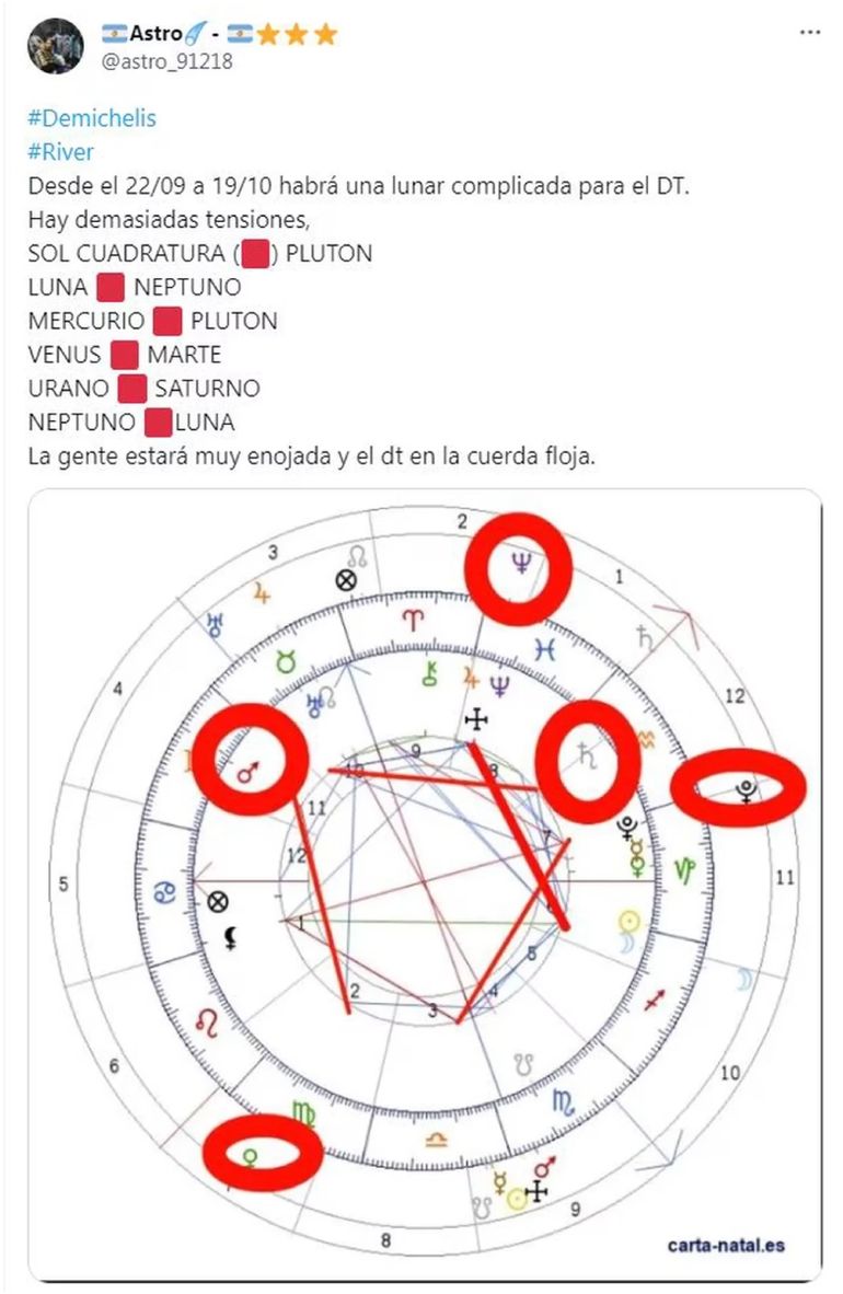 Y al parecer sigue las malas noticias para Micho, "Astro Millonario," un astrólogo que ha ganado popularidad en el mundo del fútbol, dio una fuerte predicción en donde asegura que el entrenador Martín Demichelis enfrentará dificultades durante todo el mes. "Desde el 22/09 a 19/10 habrá una lunar complicada para el DT. Hay demasiadas tensiones. La gente estará muy enojada y el entrenador en la cuerda floja," anunció este particular astrólogo de River.
