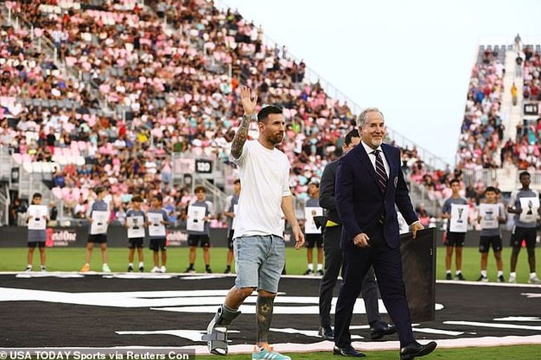 El futbolista fue homenajeado por el club con sede en Fort Lauderdale tras convertirse en el jugador con más títulos (45) en la historia del fútbol. En ese marco la institución mostró imágenes portadas por niños exhibiendo cada uno de los títulos colectivos conseguidos hasta el momento en su carrera, mientras él ingresaba al campo de juego del Chase Stadium con una bota ortopédica y una caminata lenta con dificultades, parte del proceso de recuperación de la lesión.