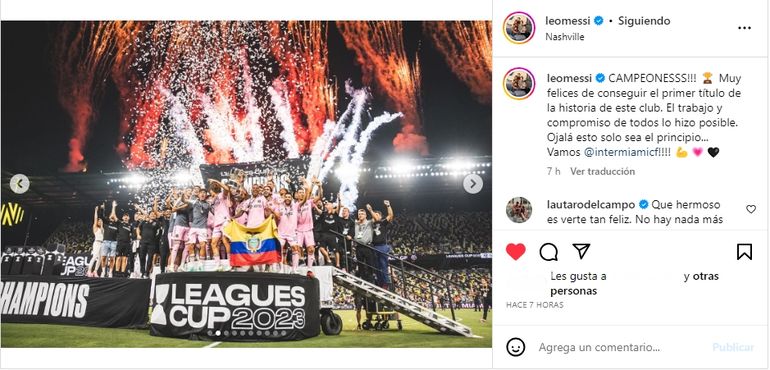 “CAMPEONESSS!!! Muy felices de conseguir el primer título de la historia de este club. El trabajo y compromiso de todos lo hizo posible. Ojalá esto solo sea el principio... Vamos @intermiamicf!”, escribió Lionel Messi para exponer la alegría que mantiene luego de ser campeón.