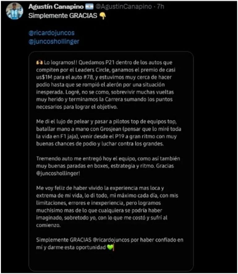 “¡¡Lo logramos!! Quedamos P21 dentro de los autos que compiten por el Leaders Circle, ganamos el premio de casi us$1M para el auto #78, y estuvimos muy cerca de hacer podio hasta que se rompió el alerón por una situación inesperada. Logré, no se como, sobrevivir muchas vueltas muy herido y terminamos la Carrera sumando los puntos necesarios para lograr el objetivo”, agregó Ricardo Canapino en su comunicado.