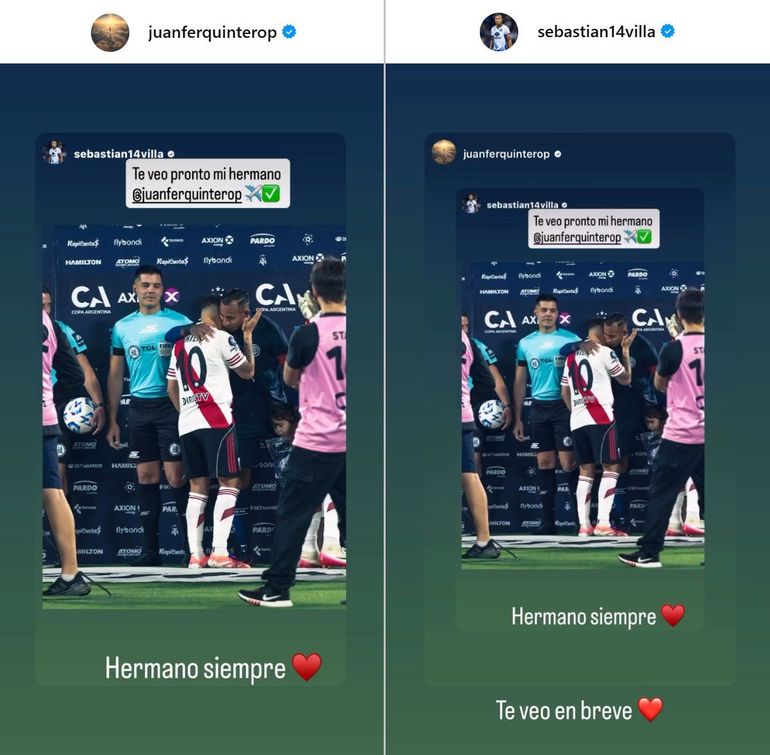 Una publicación en la cuenta de Instagram de Sebastián Villa junto a Juanfer Quintero, con el mensaje "te veo pronto hermano", generó especulaciones sobre un posible arribo del delantero a River.
