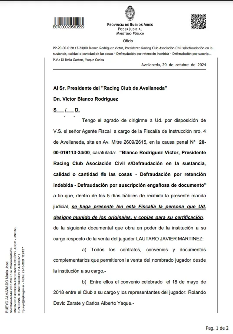 Víctor Blanco, quien era presidente de Racing en ese momento y lo sigue siendo hoy en día, fue llamado a presentarse en la Fiscalía de Instrucción número 4 de Avellaneda con la obligación de llevar documentación relacionada al traspaso.